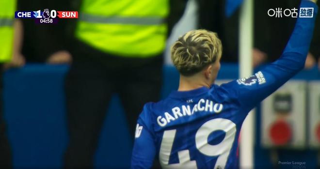 开场仅仅4分钟,切尔西快速反击,加纳乔左侧接球带球进入禁区,踩两下单车后向外线晃动直接一脚低射连入两门得分,帮助球队主场迅速取得领先,这也是加纳乔加盟切尔西之后的首粒进球。